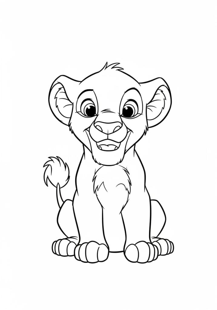 This coloring page shows young Simba as a cub, seated in the most irresistibly cute pose with his chunky little paws planted firmly in front of him and that signature wide grin spread across his face. The lines are smooth and relatively fine compared to some of the other classic Disney character pages, which gives the whole illustration a softer, more delicate feel that really suits his fluffy cub energy. Small clusters of short sketch-like lines add texture to his chest fluff, the tuft on top of his head, and the little pom at the end of his tail, making the page feel detailed without being too complicated. The centered composition keeps the focus entirely on his oversized adorable face and those big round eyes, which honestly take up a good portion of the page in the best possible way.