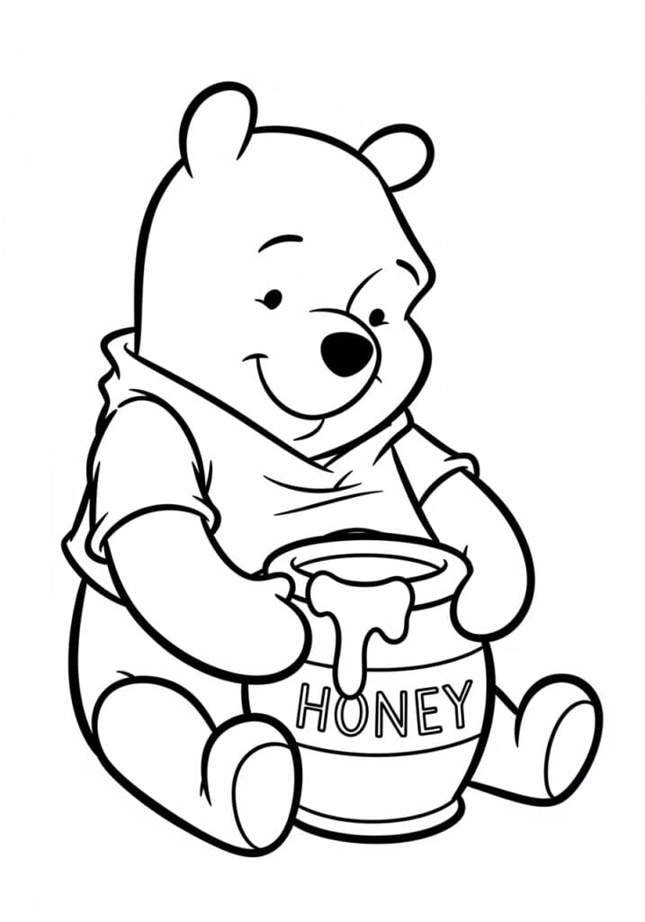 This coloring page shows the roly-poly bear we all adore sitting contentedly on the ground, arms wrapped around his beloved honey pot with the word “HONEY” printed right on the front. The design uses thick, confident outlines that give Pooh his characteristically soft and rounded appearance, and a few gentle curved lines across his tummy hint at his little red shirt without overcomplicating things. The honey pot itself is a lovely focal point in the center of the composition, complete with a drizzle of honey spilling over the rim that adds a really charming detail to the overall layout. The whole page has a wonderfully cozy, unhurried feel to it, much like Pooh himself.