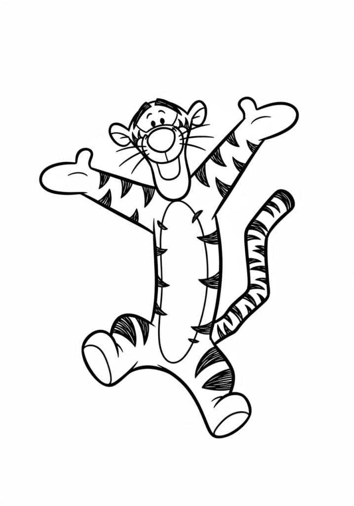 This coloring page captures Tigger mid-bounce with his arms flung out wide, legs going in completely different directions, and that big striped tail curling up behind him like it’s trying to keep up with the rest of his body. The design is packed with his iconic black stripes, which appear all over his body, face, tail, and limbs in varying sizes and directions, giving the whole page a really lively, energetic texture to work with. The outlines are bold and expressive, with looser, sketchier lines used for the stripe details that add a fun hand-drawn quality to the illustration. The diagonal composition of his bouncing pose fills the page dynamically and makes the whole thing feel like it’s literally in motion.