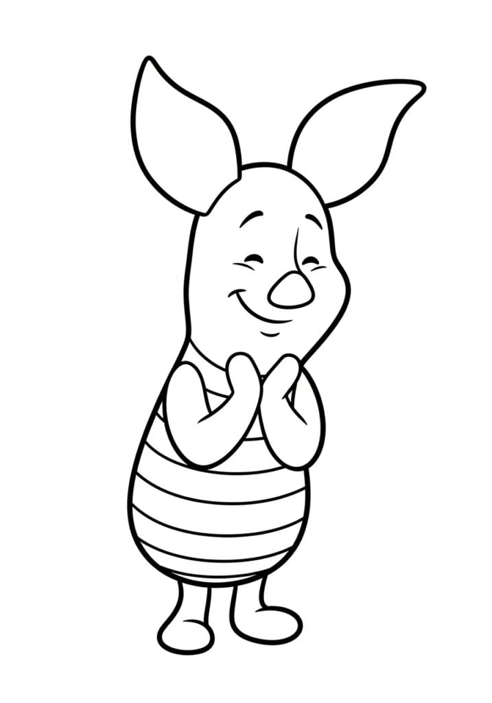This coloring page shows the sweetest little Piglet standing upright with his tiny hands clasped together in front of his chest, eyes crinkled shut in the most contented smile you’ve ever seen. His oversized ears are one of the first things you notice, each one a lovely wide teardrop shape that frames his round little head perfectly. The horizontal stripes on his outfit are a really charming detail that run neatly across his round tummy, giving the lower half of the design a lovely rhythmic pattern to work through. The outlines are clean and confident throughout, and the overall layout is beautifully balanced, with Piglet centered on the page in a pose that is just dripping with wholesome, gentle energy.