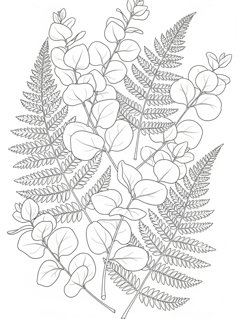 This botanical coloring page brings together soft eucalyptus style leaves and detailed fern fronds in a flowing layered arrangement. Rounded leaves with smooth edges overlap gently with feathery fern patterns which creates a beautiful contrast in texture. The line work is fine and clean with subtle vein details that keep everything elegant and easy to color. The layout feels organic and balanced with the stems crossing naturally so the whole design looks like a freshly gathered bundle of greenery.