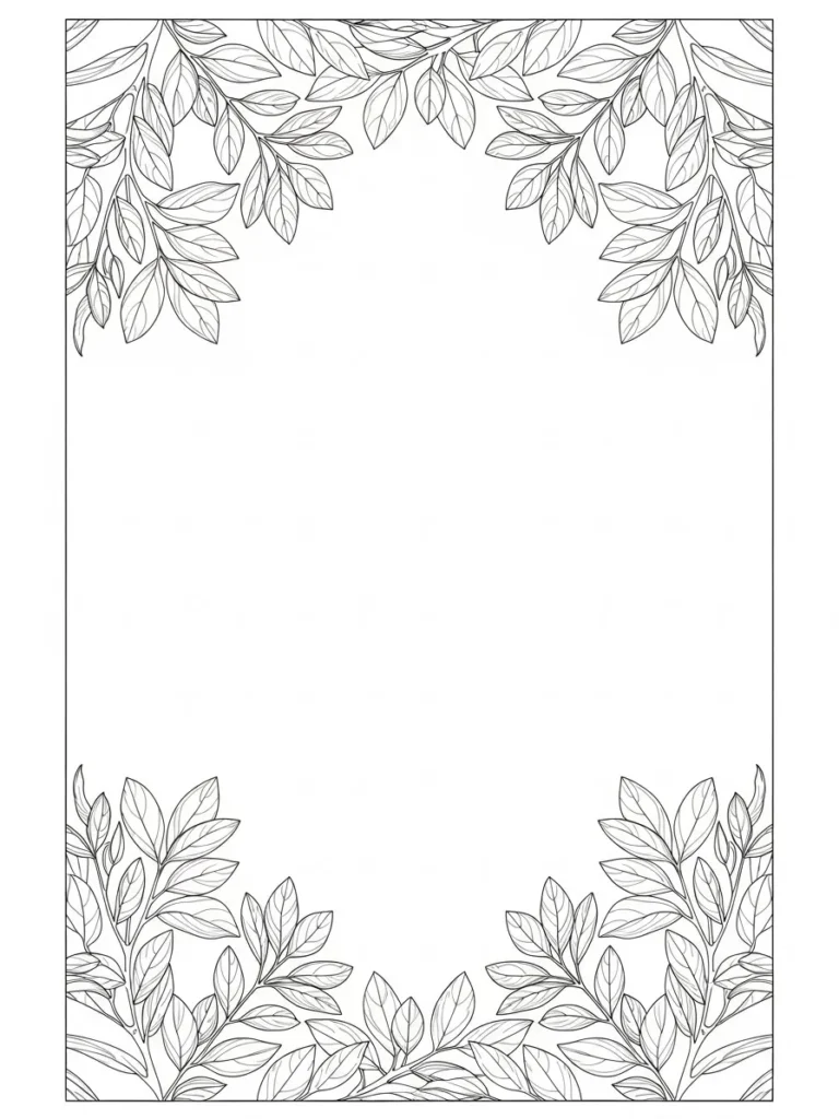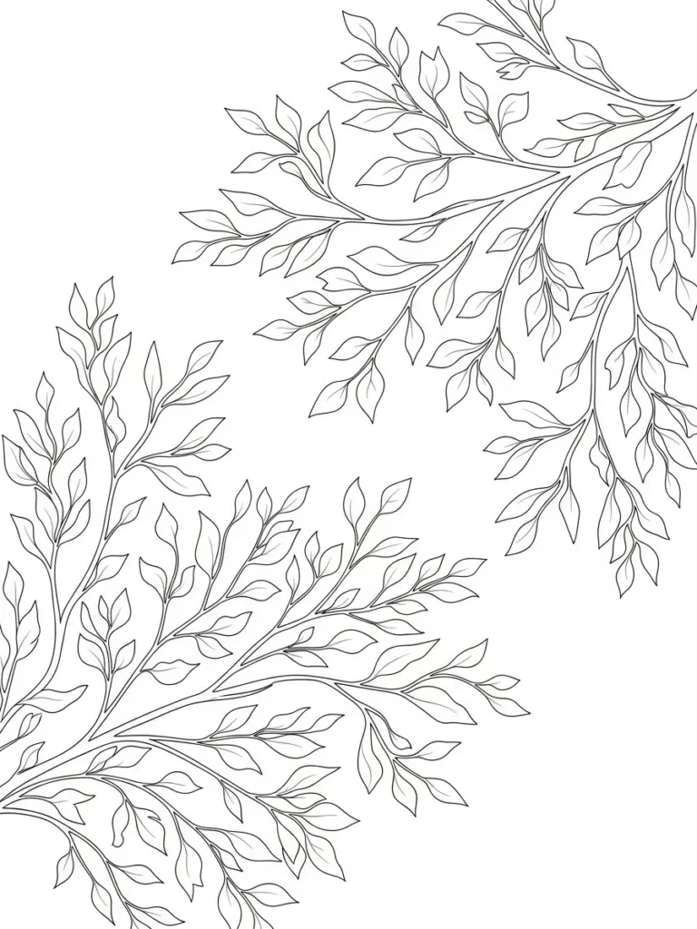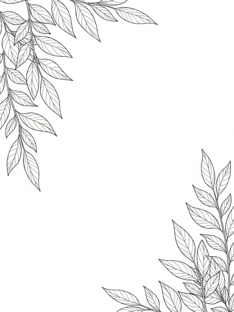This botanical coloring page uses leafy branches to softly frame the page from the corners, leaving a wide open center that feels light and uncluttered. The leaves are slender with gentle curves and fine vein details that keep the design elegant and easy on the eyes. Line thickness stays delicate and consistent which gives the whole page a graceful flowing look. I really like how the foliage feels intentional but not overpowering, almost like a natural border grown rather than drawn.