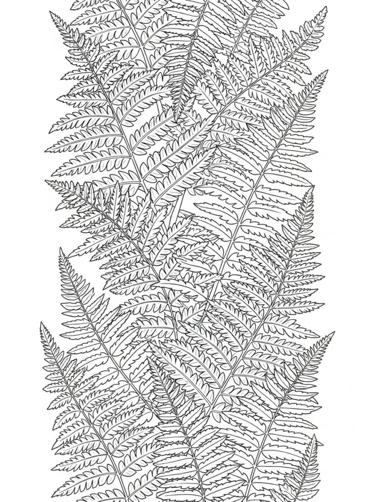 This botanical coloring page is filled edge to edge with layered fern fronds creating a rich textured pattern. Each fern leaf is packed with tiny repeating segments that overlap and weave together in a flowing vertical layout. The line work is fine and detailed which gives the design depth while still keeping the shapes clear and easy to follow. I love how the fronds curve and cross naturally so the page feels full of movement without looking chaotic.