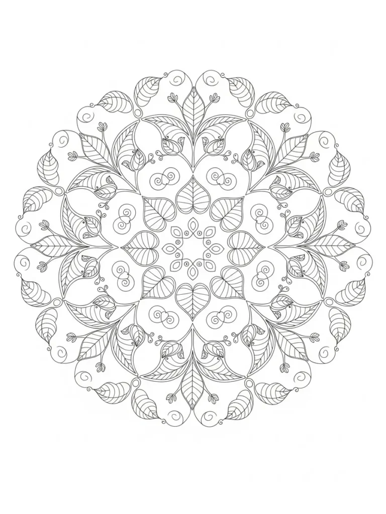 This botanical coloring page features a circular mandala filled with playful leaf shapes soft curves and tiny swirling accents. Each section repeats gracefully around the center creating a balanced design that feels decorative and organic at the same time. The leaves vary in size and shape with fine vein lines that add texture without making the page feel heavy. I love how the clean outlines and open spaces keep the mandala detailed yet approachable for a slow relaxing coloring session.