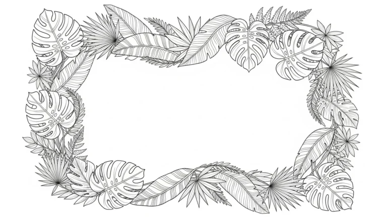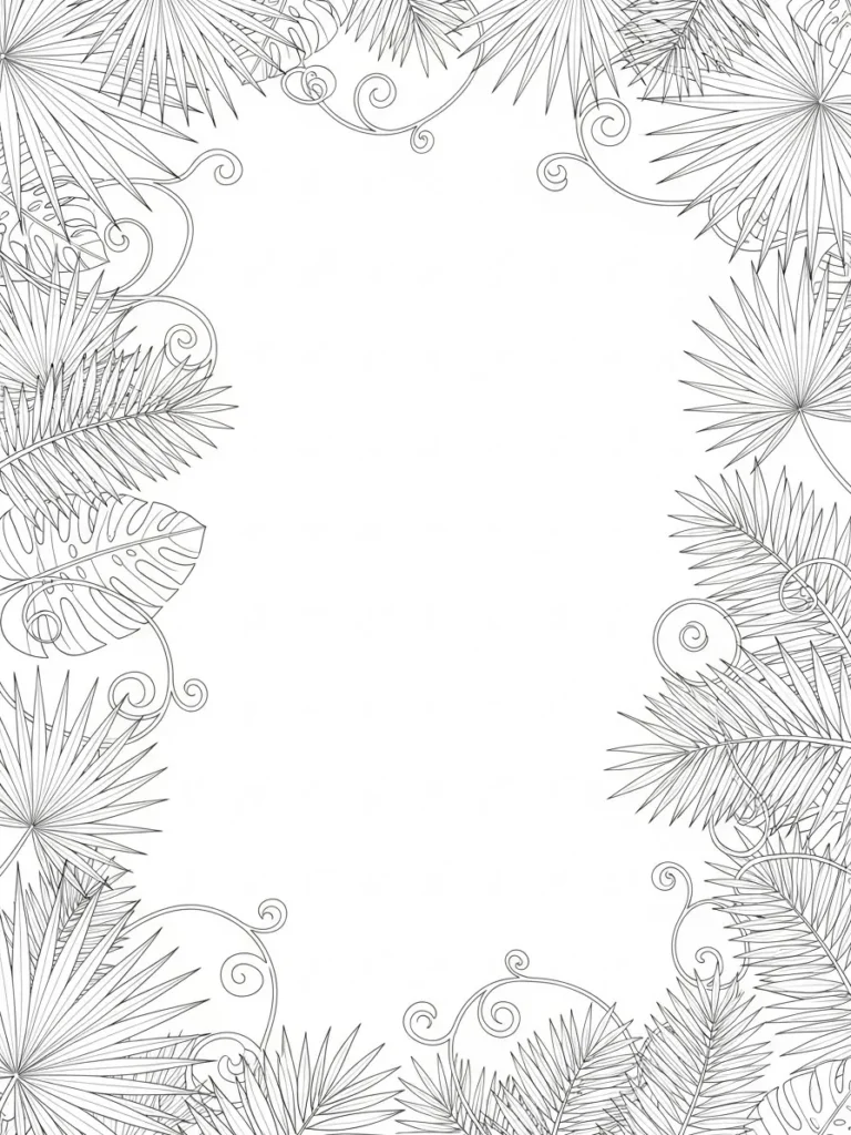 This botanical coloring page features bold palm fronds and tropical leaves arranged into a loose rectangular frame around an open center. Spiky fan palms mix with curved monstera style leaves while delicate swirling vines weave between them for extra movement. The line work is fine and detailed but still clean which keeps the design elegant rather than heavy. I love how the foliage feels lush and energetic while the center stays open and uncluttered.