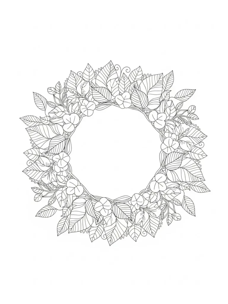 This botanical coloring page features a beautifully balanced circular wreath made from layered leaves and small rounded blossoms. The leaves vary in shape and size which adds depth and movement while delicate vine curls peek through for extra charm. The line work is fine and detailed with gentle veins that keep the design elegant without feeling too dense. I love how the open center creates a calm focal point while the wreath itself feels lush and full all the way around.