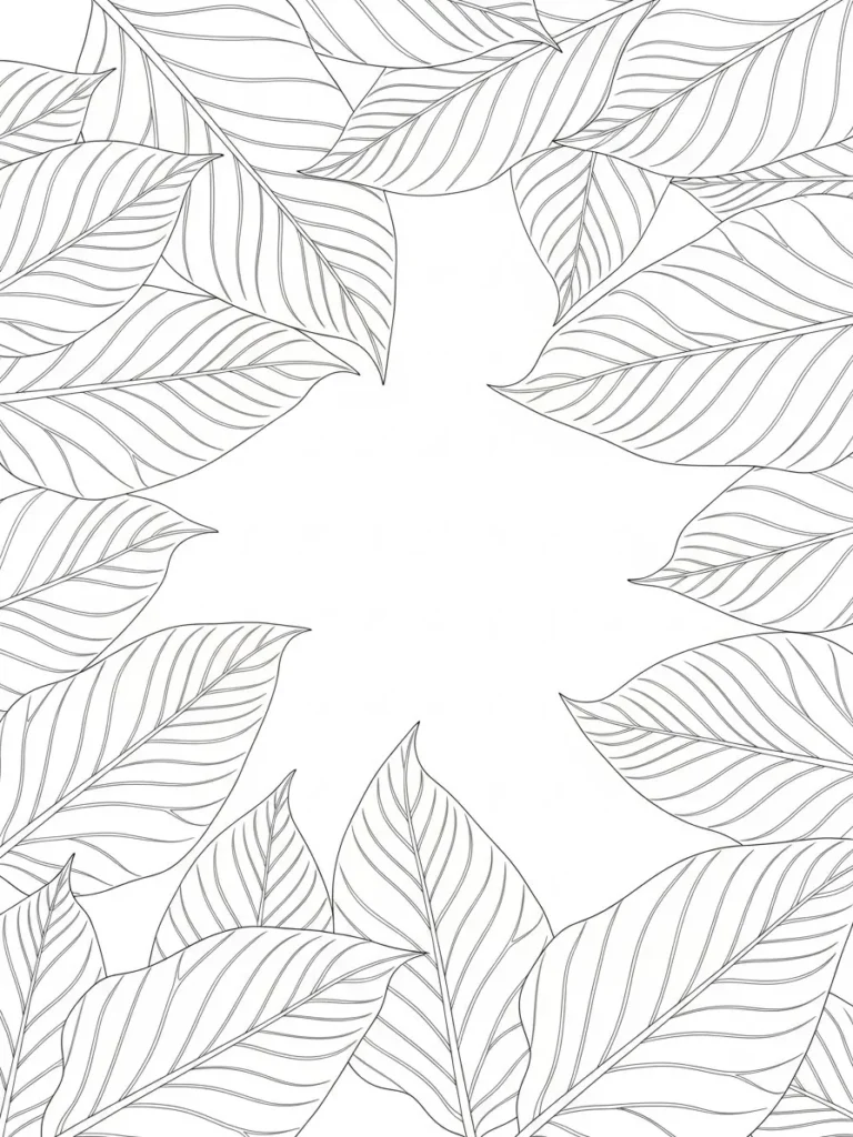 This botanical coloring page features large overlapping leaves forming a soft frame around an open center. Each leaf has smooth flowing edges and fine vein lines that curve naturally across the surface. The line thickness stays light and consistent which gives the design an elegant relaxed feel. I love how the leaves layer over one another without feeling crowded which creates a calm sense of movement while still leaving plenty of white space in the middle.