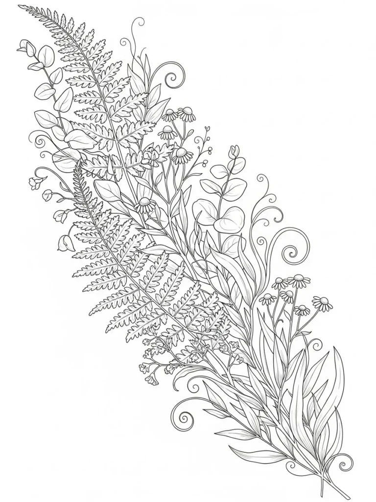 This botanical coloring page features a sweeping diagonal arrangement of ferns leafy stems and delicate wildflowers that feels wonderfully organic. Feathery fern fronds mix with rounded leaves small blossoms and curling tendrils which creates a rich variety of shapes and textures. The line work is fine and detailed with gentle curves and clear outlines that guide the eye naturally across the page. I love how the design feels full and lush on one side while leaving open space around it so everything has room to breathe.
