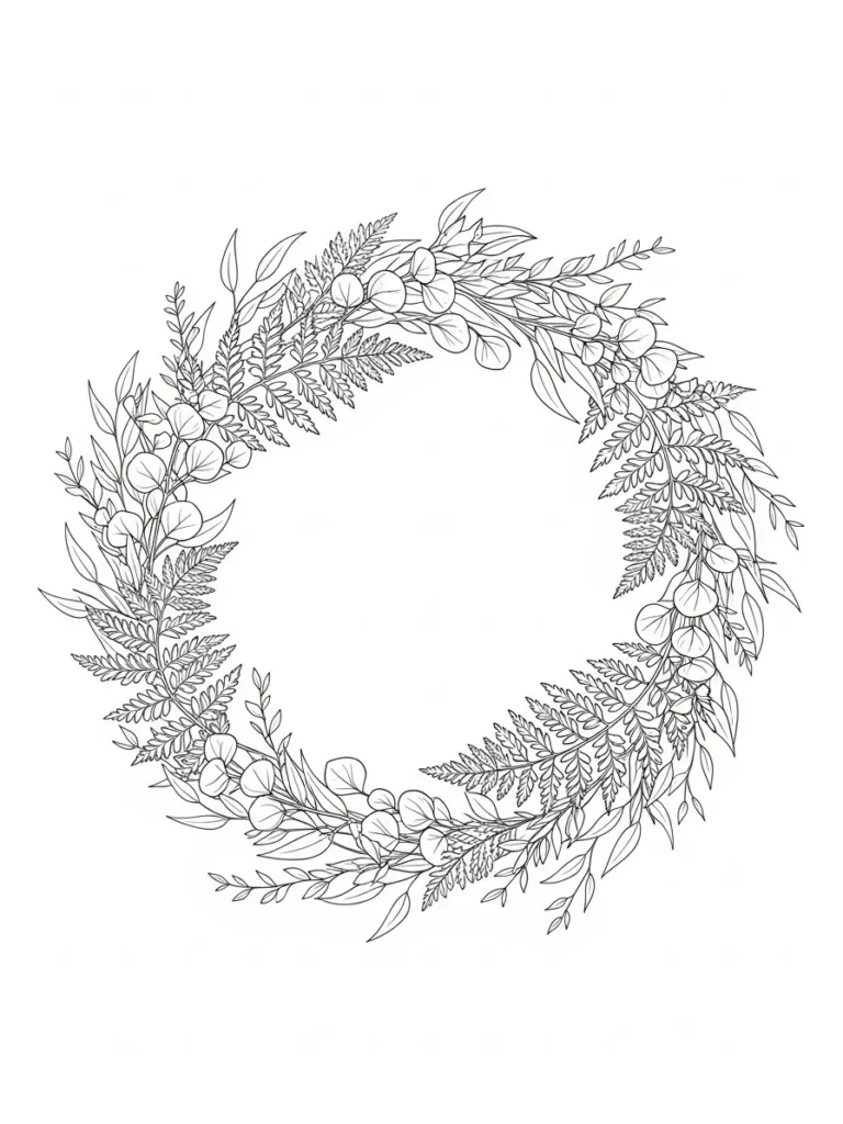 This botanical coloring page features a graceful circular wreath made from delicate fern fronds and smooth leafy branches. The leaves overlap gently and curve around the circle creating a relaxed organic shape rather than a perfectly rigid ring. Fine line work adds subtle texture to the veins and fronds while keeping the design light and elegant. The open center gives the wreath a calm airy feel that makes the greenery stand out beautifully.