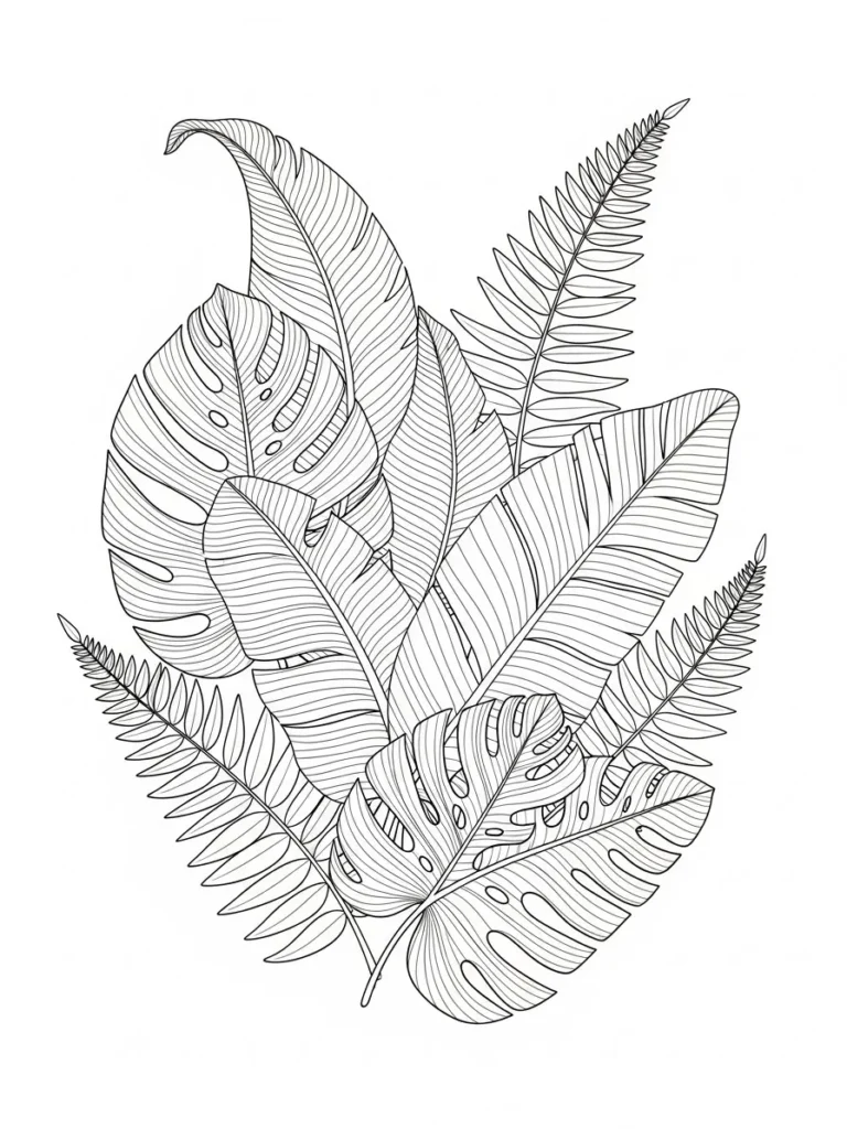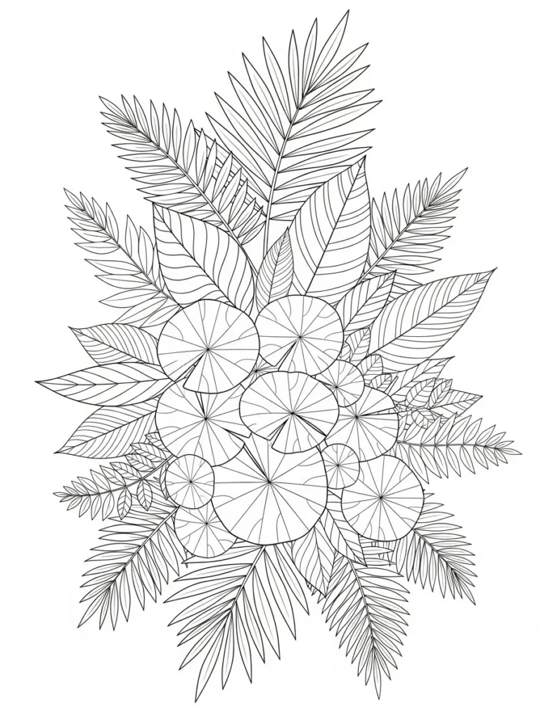 This botanical coloring page features a lush cluster of tropical leaves layered together in a rounded organic arrangement. Fan shaped leaves sit at the center while palm fronds and long curved leaves radiate outward creating lots of movement and texture. The line work is clean and detailed with fine veins that add interest without making the design feel too busy. I love how the leaves overlap naturally which gives the whole piece a full vibrant look while still keeping each shape easy to color.