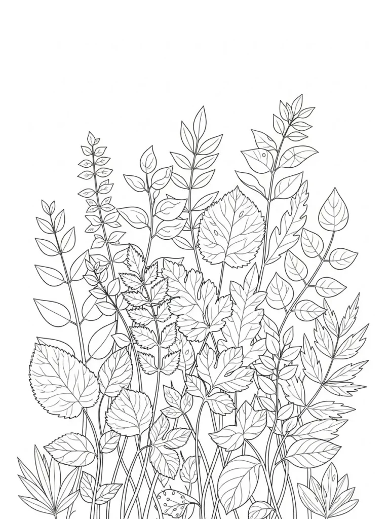 This coloring page shows a rich cluster of tall leafy stems growing upward like a relaxed garden meadow. The design mixes different leaf shapes and sizes from rounded and soft to long and pointed which keeps the layout visually interesting. Fine line work outlines each stem and leaf with delicate vein details that add texture without overwhelming the page. The composition feels full at the bottom and more open toward the top which gives it a lovely natural flow and plenty of breathing room for coloring.