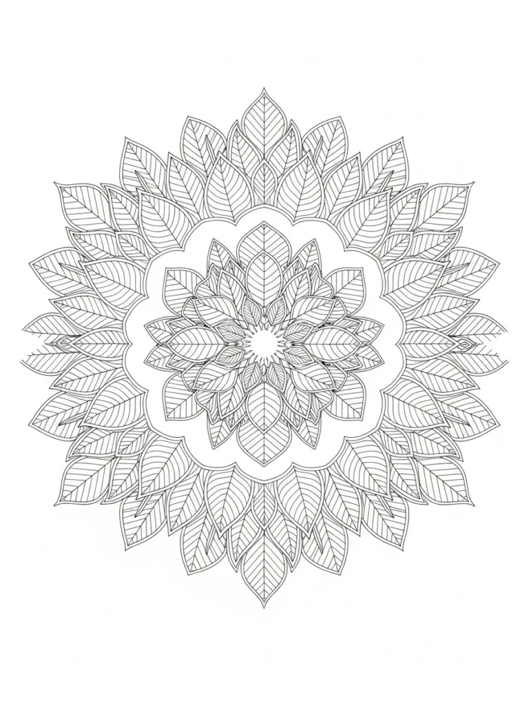 This botanical coloring page features a beautifully detailed mandala made entirely from layered leaves arranged in perfect symmetry. Each ring is filled with pointed leaf shapes stacked outward from the center creating a gentle floral illusion. Fine vein lines add texture to every leaf while the clean outlines keep the design crisp and balanced. I love how the repeating patterns feel structured yet organic which gives the whole mandala a calm harmonious look.