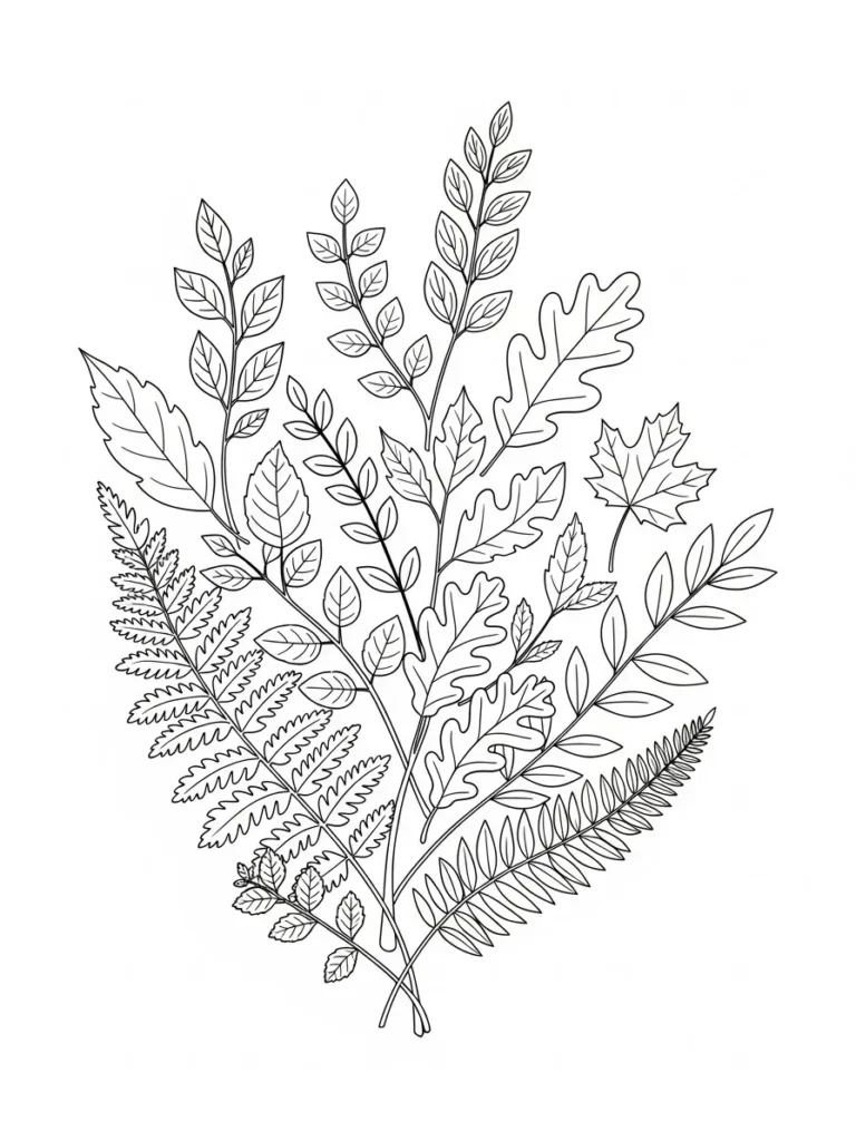 This botanical coloring page features a relaxed bouquet of different leaf types gathered together in a natural upward flow. You will spot fern fronds smooth oval leaves pointed stems and softly lobed shapes that give the design lots of visual interest. The line work stays clean and medium fine with clear vein details that make each leaf easy to color without feeling crowded. I love how the stems cross slightly at the base which makes the whole arrangement feel organic and hand gathered rather than perfectly arranged.