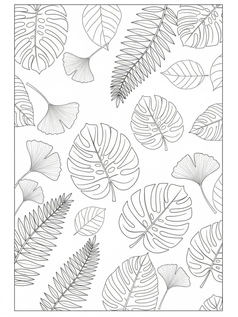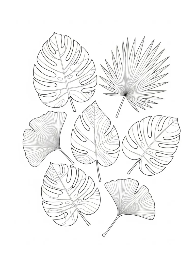 This botanical coloring page features a curated set of individual tropical leaves spaced evenly across the page. You will see bold monstera leaves with signature cutouts paired with delicate ginkgo fan leaves and a spiky palm leaf for contrast. Each leaf stands on its own with fine clean line work and detailed veins that add texture without crowding the design. The open layout feels modern and uncluttered which makes each leaf feel like a little botanical study waiting to be colored.