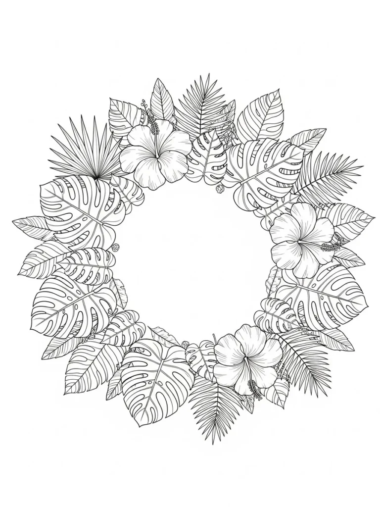 This botanical coloring page features a lush circular wreath made from layered tropical leaves and soft blooming flowers. Large monstera leaves with signature cutouts are paired with palm fronds and smooth oval leaves to create a full balanced ring. Hibiscus style flowers are tucked throughout adding gentle curves against the bold foliage. The line work is clean and detailed with fine veins and petal textures while still leaving plenty of open space for coloring. The open center makes the whole design feel airy and elegant rather than crowded.