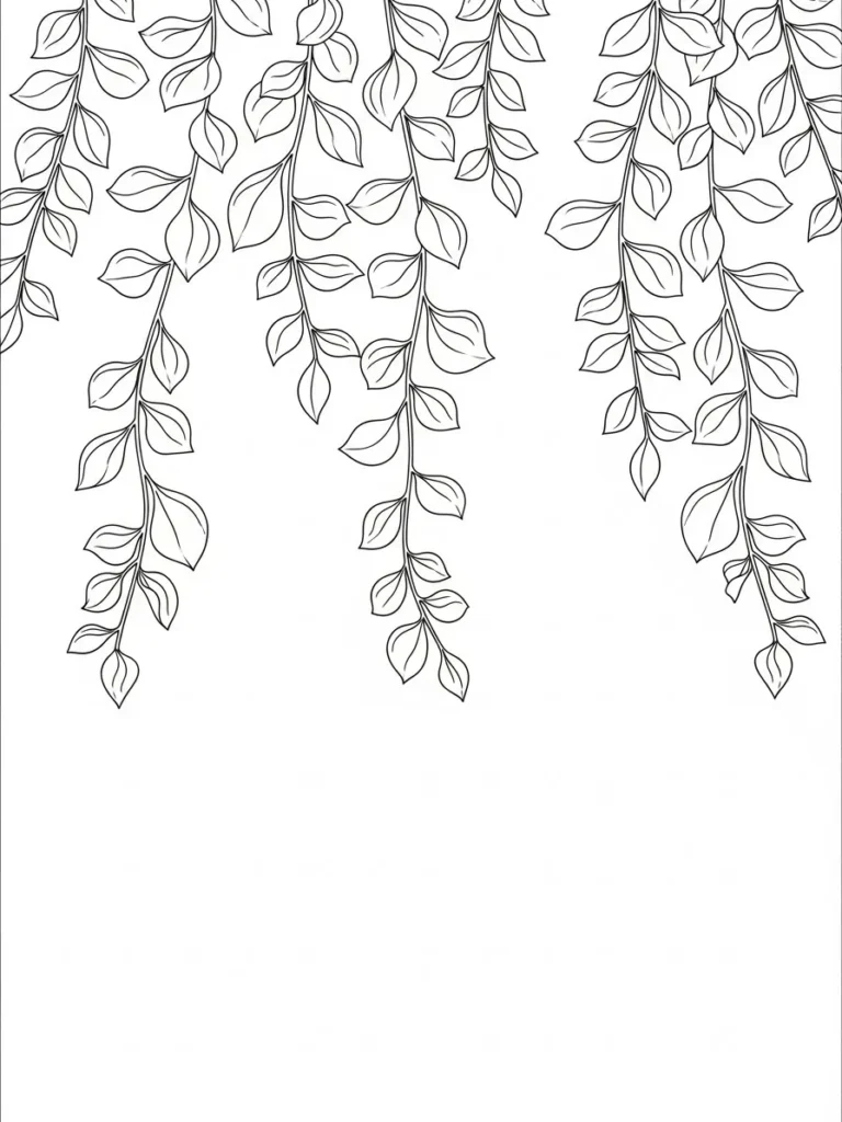 This botanical coloring page features long cascading vines filled with softly shaped leaves that trail downward in elegant strands. The leaves repeat gently along slender stems creating a soothing vertical rhythm that feels light and natural. Line work is clean and delicate with simple vein details that keep everything easy to follow while still feeling detailed enough for adult coloring. The open background gives the vines plenty of space to stand out which makes the whole design feel airy and calm.