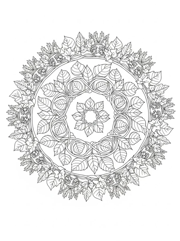This botanical coloring page features a detailed circular mandala built from layers of leaves flowers and winding vine shapes. The outer ring is full and lush with leafy clusters and blooming details while the inner circles become more structured and symmetrical. Fine line work defines every vein and petal giving the design a rich textured look without feeling messy. I love how the repeating patterns feel balanced and intentional which makes the whole mandala feel elegant and soothing to look at.