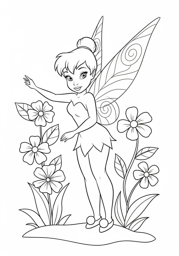 Tinker Bell Standing Among Garden Flowers Coloring Page