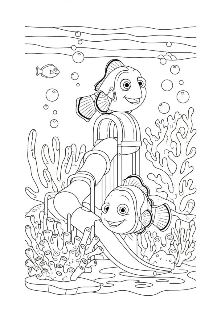 Nemo and Marlin Playing on a Coral Reef Slide Coloring Page