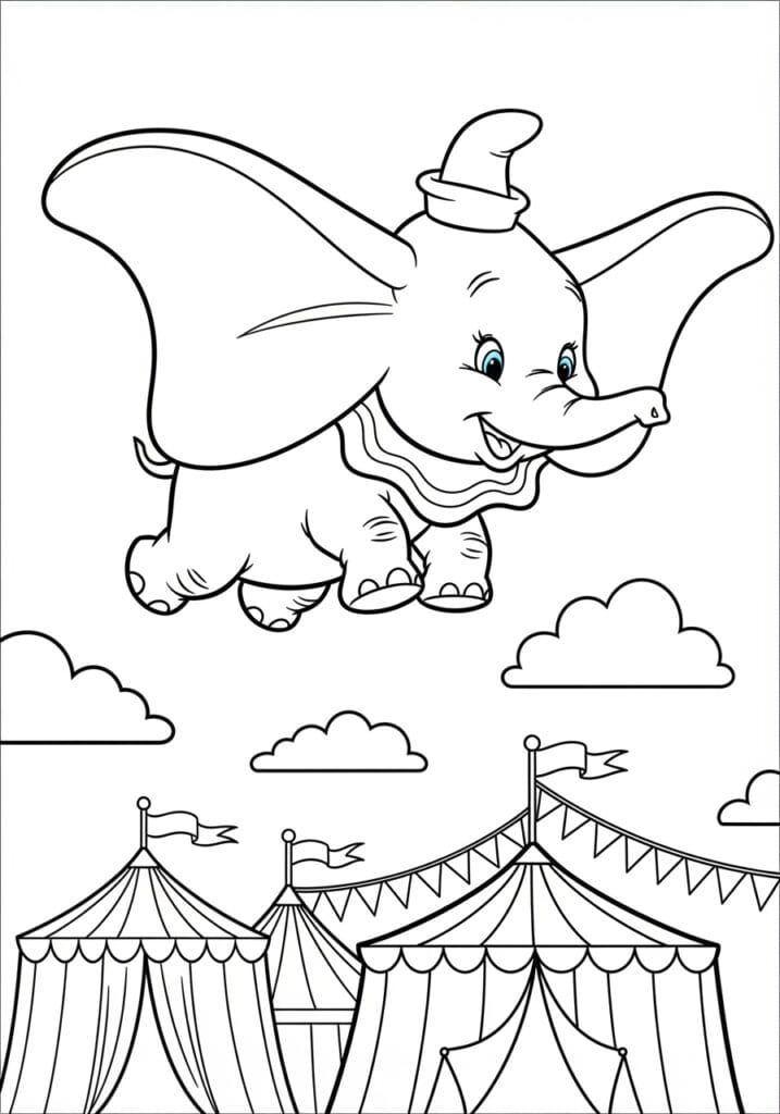 I find this page so satisfying to color because the circus tents alone are a total gift. Those alternating stripe sections are so fun to fill in, and you can go classic red and white or get creative with any color combo that feels festive to you. Personally I’d go with bold royal blue and gold for a more regal circus feel. Then Dumbo himself is this wonderfully large smooth area of soft grey with those big expressive eyes that are just so sweet to bring to life with color. The whole page has this really uplifting energy that makes you feel good while you’re coloring it, which honestly is exactly what a coloring page should do.