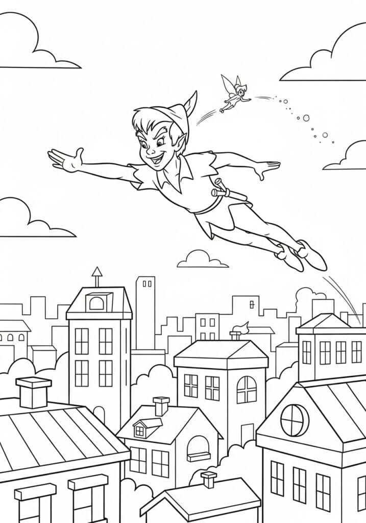 Peter Pan and Tinker Bell Flying Over London at Night Coloring Page