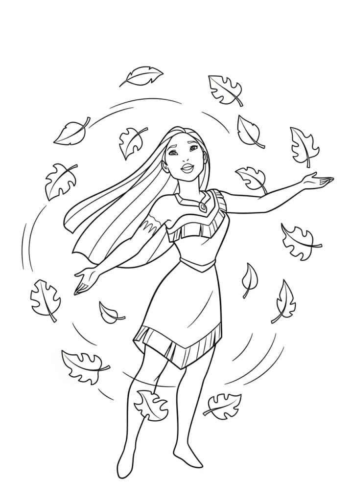 Pocahontas Dancing in a Swirl of Autumn Leaves Coloring Page