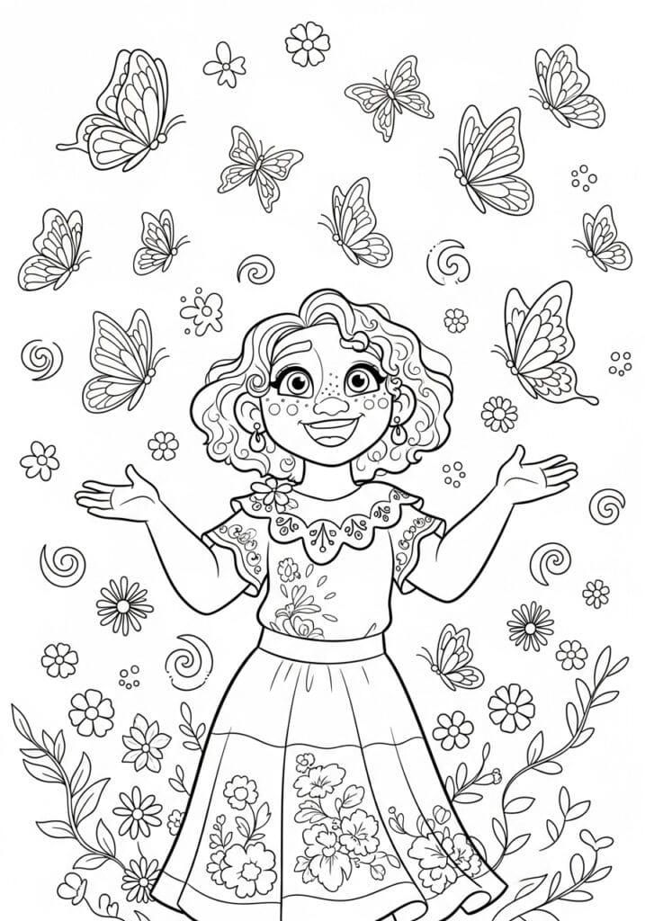 Mirabel From Encanto Surrounded by Butterflies and Flowers Coloring Page