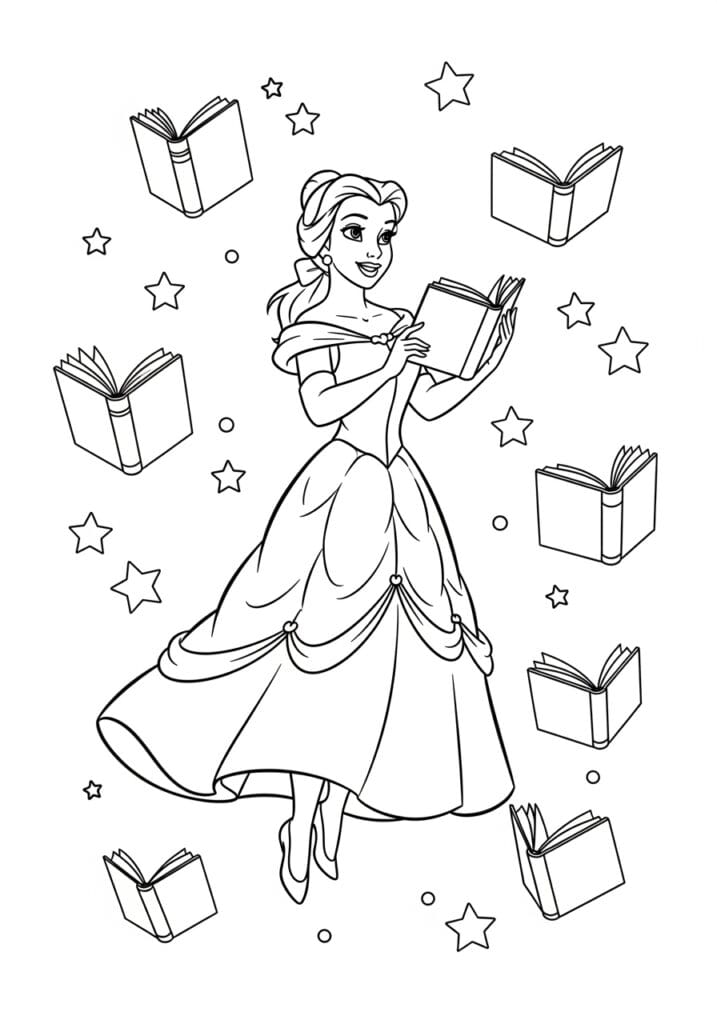 Belle Floating Among a Cloud of Magical Books Coloring Page