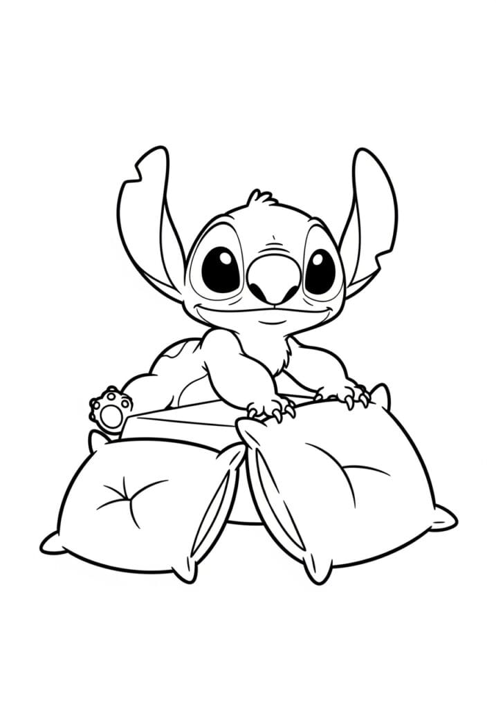 Stitch Cuddling Up on a Pile of Pillows Coloring Page