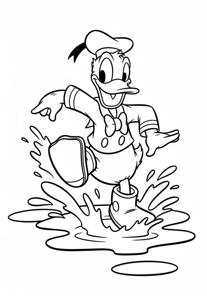 Donald Duck Splashing Through a Puddle in His Rain Boots Coloring Page