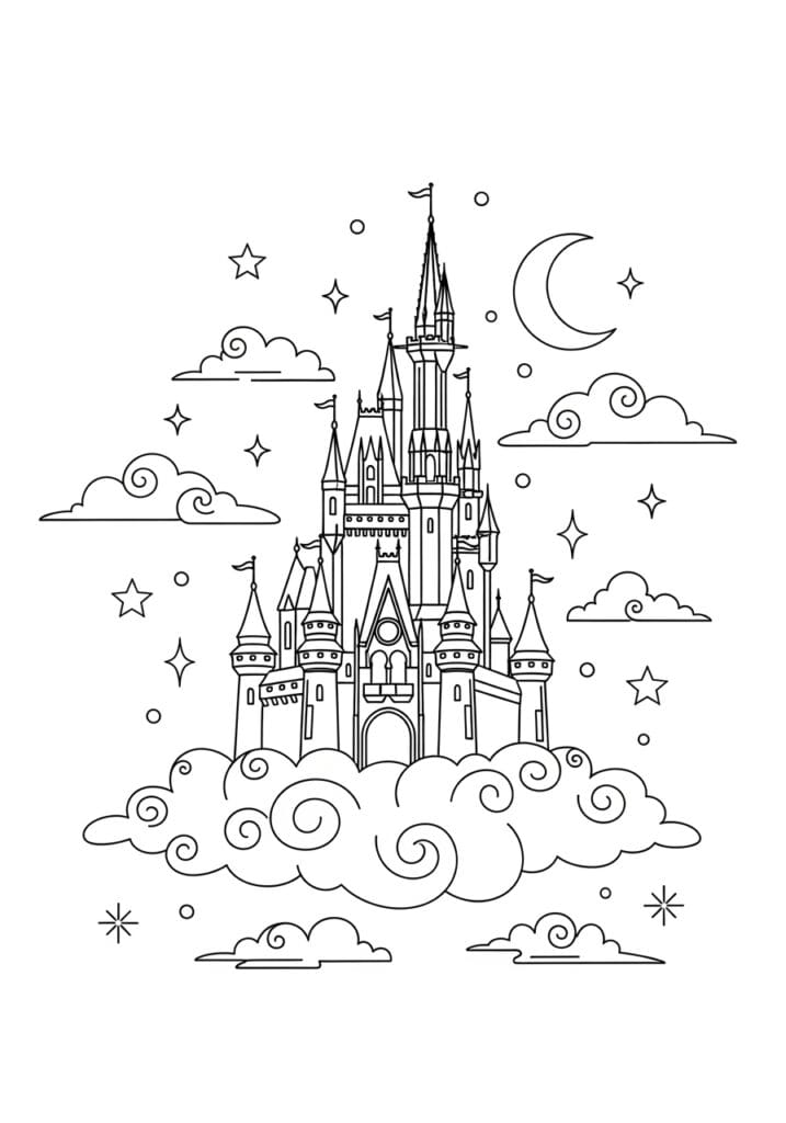 This one is straight-up magical. The iconic Disney castle rises tall and proud right in the center of the page, with multiple pointed spires, tiny flags, arched windows, and all that gorgeous architectural detail you’d expect. What makes this design extra special is that the castle appears to be floating on a bed of swirly decorative clouds, which wrap around the base in the most dreamy way. The surrounding sky is filled with a crescent moon, scattered circle dots, and a mix of four-pointed sparkle stars and classic five-pointed stars of varying sizes. The clouds throughout the page have beautiful spiral curl details inside them, giving the whole scene a really elegant, almost whimsical storybook quality. The line work is finer and more delicate than your typical coloring page, which makes it feel a little more grown-up and artsy.
