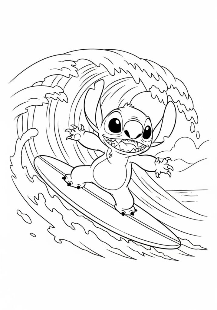 This page has the most incredible sense of movement and energy of any coloring page I’ve seen in a while. Stitch is right in the middle of the action, crouching low on his surfboard with claws out and that wild toothy grin that makes him so loveable. The real showstopper here is the massive curling wave that dominates almost the entire page, with beautifully detailed flowing lines that spiral and crash around Stitch in the most dramatic way. The water is filled with long curved parallel lines that create a really satisfying sense of rushing motion, along with foam and spray details at the edges and the crest of the wave. Stitch himself has softer, rounder linework compared to the dynamic wave surrounding him, which creates a lovely contrast between the chaos of the ocean and his totally unbothered surfing expression.