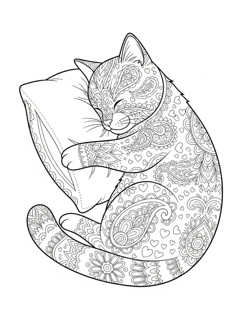 This coloring page shows a sweet curled up cat cuddling a soft pillow, wrapped in flowing paisley patterns, tiny hearts, and floral details. The line work is clean and smooth with a mix of medium and fine lines that give the design a cozy but detailed feel. The cat’s body is covered in layered ornamental shapes that flow naturally from head to tail, while the pillow adds a calm open space that balances all the intricate details. The overall layout feels gentle and comforting, with the cat tucked in like it is ready for the best nap ever.