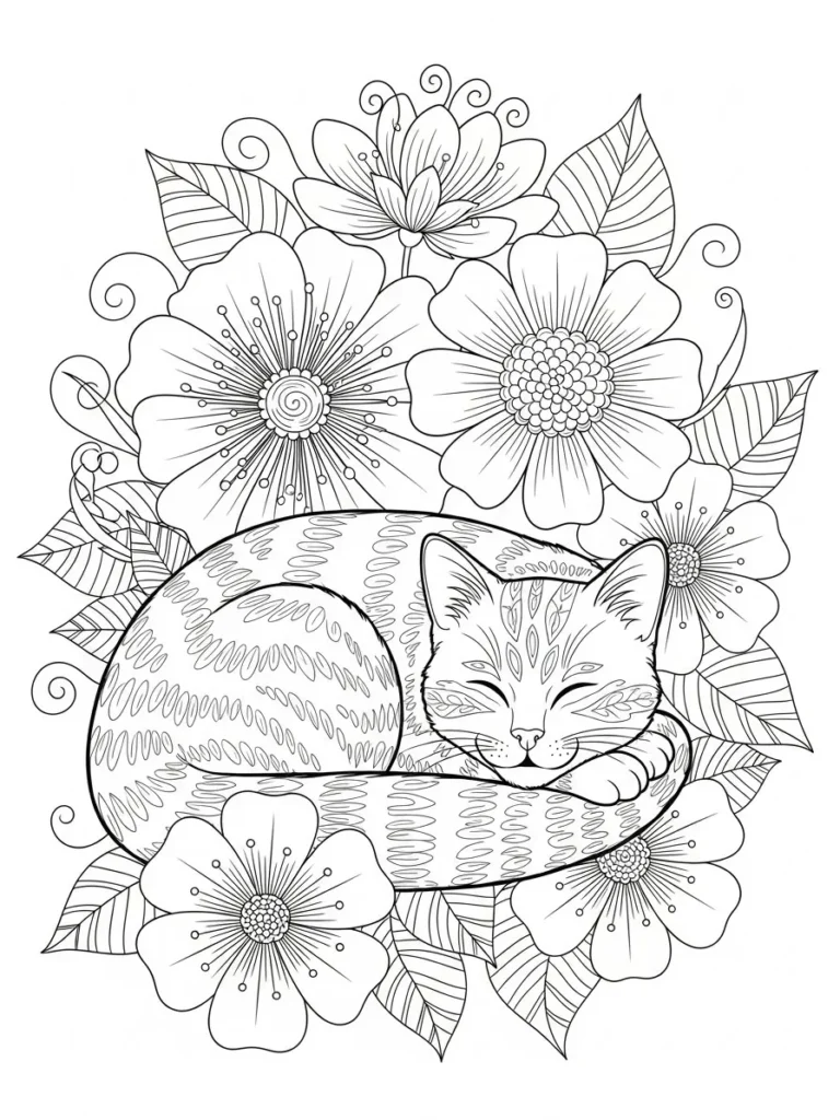 This coloring page shows a calm curled up cat resting in the center of a lush floral arrangement. Large open flowers with layered petals and detailed centers surround the cat, while leafy stems and soft curls fill the background. The cat itself has gentle patterning across its fur that adds interest without overpowering the scene. Line work is clean with a mix of smooth curves and fine details, creating a balanced layout that feels full but not overwhelming.