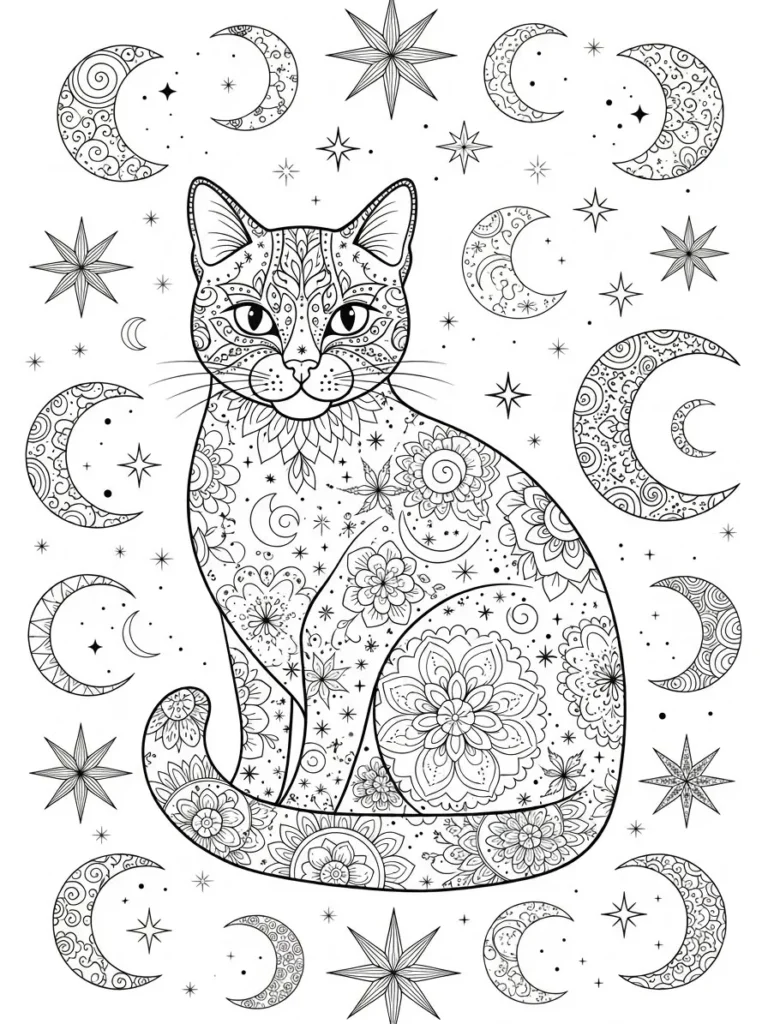 This coloring page features a graceful sitting cat surrounded by crescent moons sparkling stars and bold celestial shapes. The cat’s body is filled with intricate floral and mandala inspired patterns that flow smoothly across its form, while the background is dotted with moons and starbursts that feel magical without being cluttered. The line work is fine and detailed with clean outlines that keep everything crisp and easy to follow. The overall layout feels balanced and dreamy, with the cat standing calmly at the center of a starry night scene.