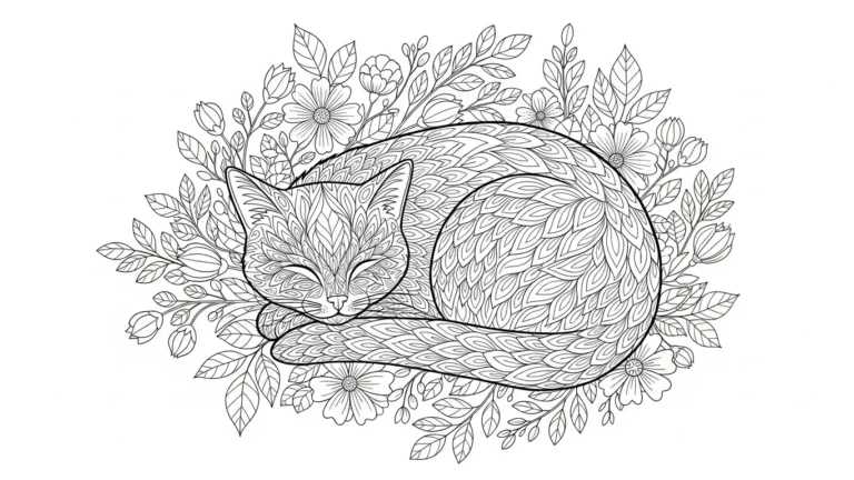 Some people love coloring florals and this page gives me the best of both worlds with flowers and a sleepy cat in one cozy scene. I enjoy taking my time on the petals and then switching to softer tones for the cat to keep everything feeling peaceful. Coloring this one always slows me down in the nicest way and leaves me feeling relaxed like I just spent time in a quiet garden with a napping kitty.