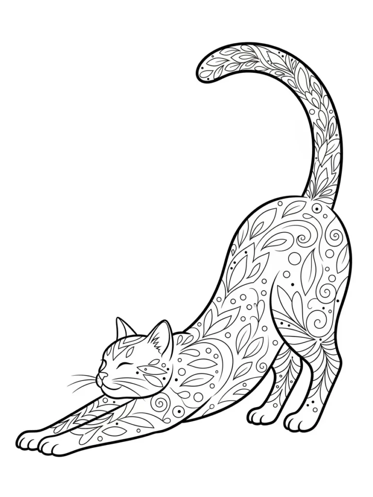 This coloring page shows a relaxed cat stretching forward with its tail curved high in the air, captured in that familiar cozy stretch we all recognize. The cat’s body is filled with leafy botanical patterns, soft swirls, and tiny dots that flow naturally with the pose. The line work mixes bold outer outlines with finer interior details, making the shape feel strong yet graceful. The open background keeps the focus on the stretch and gives the whole design a clean airy look.