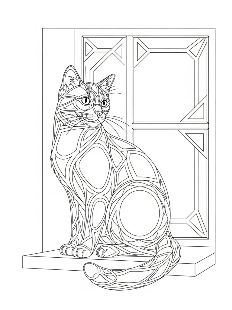 This coloring page shows a thoughtful cat sitting on a window sill, gazing outward as if watching the world go by. The cat’s body is filled with smooth geometric and flowing shapes that create a modern stained glass style look. Clean consistent line work defines each section clearly, while the window frame adds structure and a cozy indoor feel. The overall layout feels calm and balanced, with plenty of open space that keeps the design from feeling too busy.