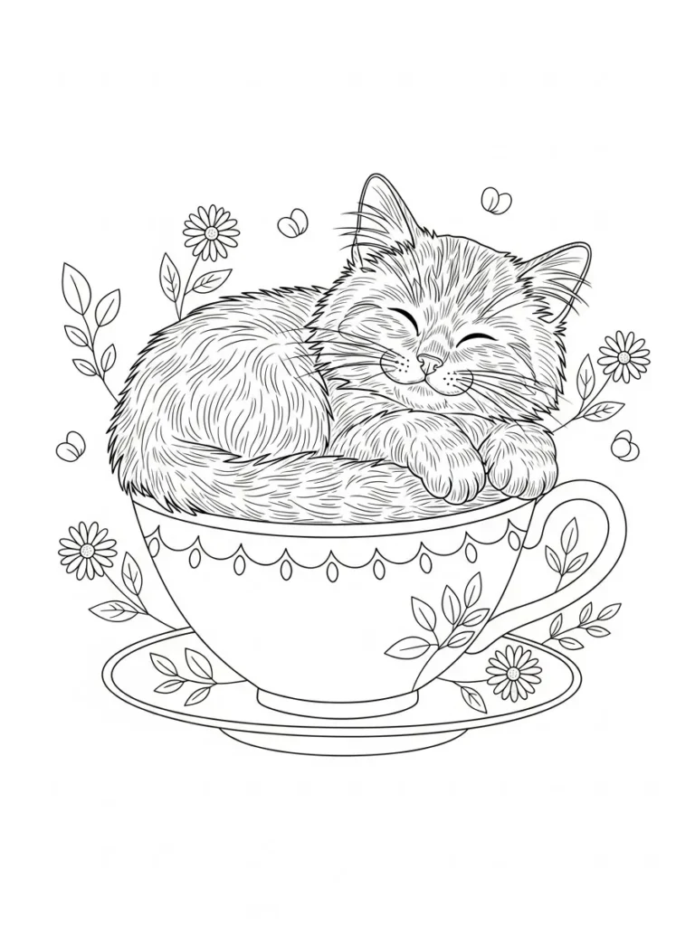 This coloring page shows an adorable fluffy kitten curled up inside a teacup, fast asleep with a peaceful smile on its face. The kitten’s fur is drawn with soft flowing lines that add texture without feeling too busy, while the teacup features gentle decorative details along the rim and base. Small flowers leaves and tiny heart shapes surround the cup, giving the whole design a sweet cozy vibe. The line thickness is clean and balanced, making it easy to color while still feeling detailed and charming.