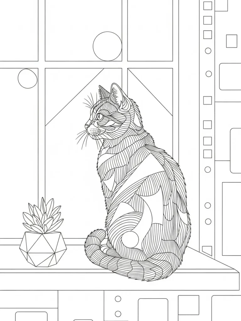Coloring this page feels like a little moment of calm captured just for me. I adore how the geometric planter contrasts with the organic curves of the cat’s body, giving me a fun challenge to use wildly different color palettes for each section. I can imagine giving the cat warm tabby stripes using soft oranges and creams while making the background window panes a cool, muted blue for that perfect cozy indoor vibe. It’s engaging because there’s so much surface area to play with the fine lines, making every tiny stroke feel purposeful and relaxing.