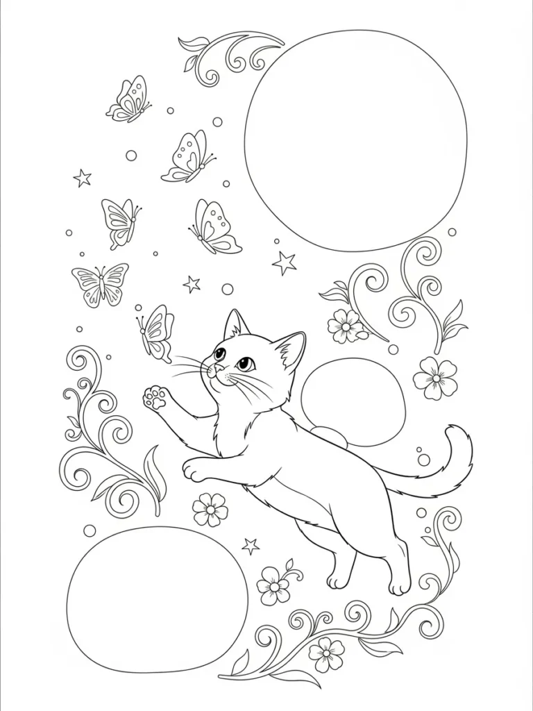 Oh my gosh, I just adore the sheer joy in this little kitty’s face as he tries to catch those butterflies! It makes me want to grab my brightest pinks and sky blues right away. This page is so much fun because I can totally lean into a fantasy garden look with vibrant greens and sparkling colors on the butterflies, or I could keep it softer with pastel shades for a dreamy effect. I think coloring those elaborate swirls will be incredibly soothing, and the big empty ovals mean I have room to practice my shading skills or just let the color bleed out beautifully. It’s pure, lighthearted fun.