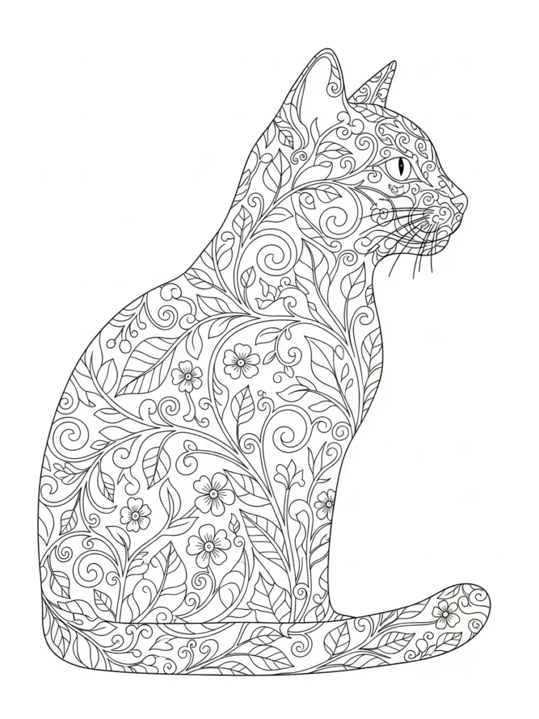This gorgeous coloring page showcases a perfectly profiled, seated cat whose entire body is filled with an intricate tapestry of botanical designs. You’ll find swirling vines, delicate leaves, and small, sweet flowers woven together tightly from the tip of the ear down to the curve of the tail. The overall impression is one of natural magic, like a woodland sprite disguised as a feline. The line work is very fine and detailed throughout, making this a pure Zentangle-style treat contained within a familiar animal shape, standing out boldly against the white background.