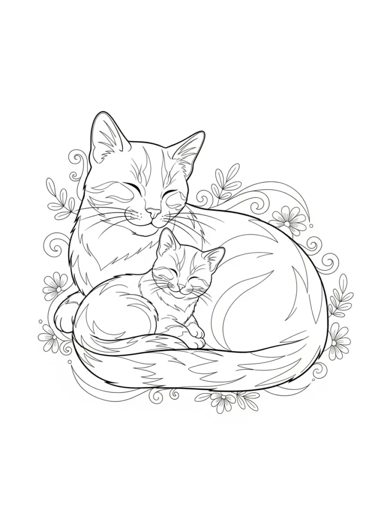 This illustration perfectly captures a moment of pure feline affection featuring a larger, smiling mother cat lovingly curled around her tiny, sleeping kitten. The animals are drawn with smooth, soft outlines, featuring simple etched lines to suggest fur texture and light stripes, keeping the focus entirely on their sweet interaction. The duo is nestled within a lovely border of simple, stylized floral elements and gentle swirls that enhance the cozy, serene atmosphere without overwhelming the central subjects. The line work is generally medium thickness and very clean, making the whole image pleasing to the eye.
