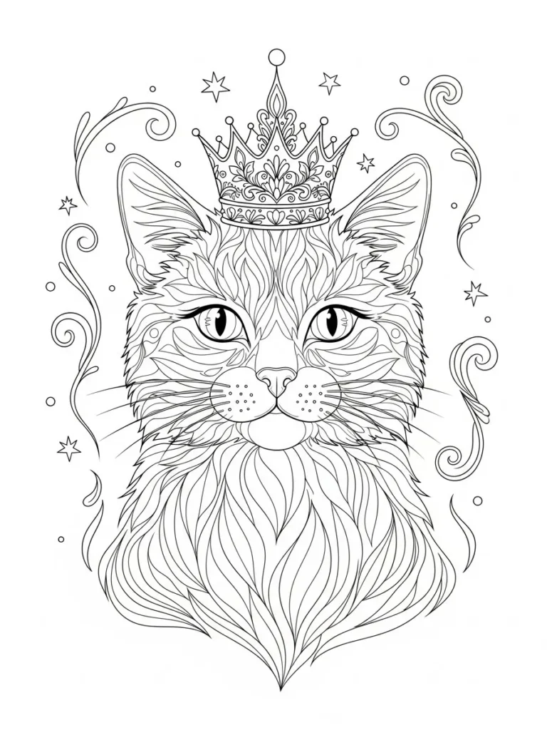 This coloring page features a majestic front facing cat wearing an ornate crown, surrounded by soft swirls and tiny star accents. The fur is drawn with long flowing lines that create a graceful layered texture, especially through the cheeks and chest. Delicate decorative details appear in the crown and subtle patterns around the face, while the line thickness stays clean and consistent for a polished look. The symmetrical layout makes the cat feel powerful and elegant, almost like a feline portrait meant for a storybook.