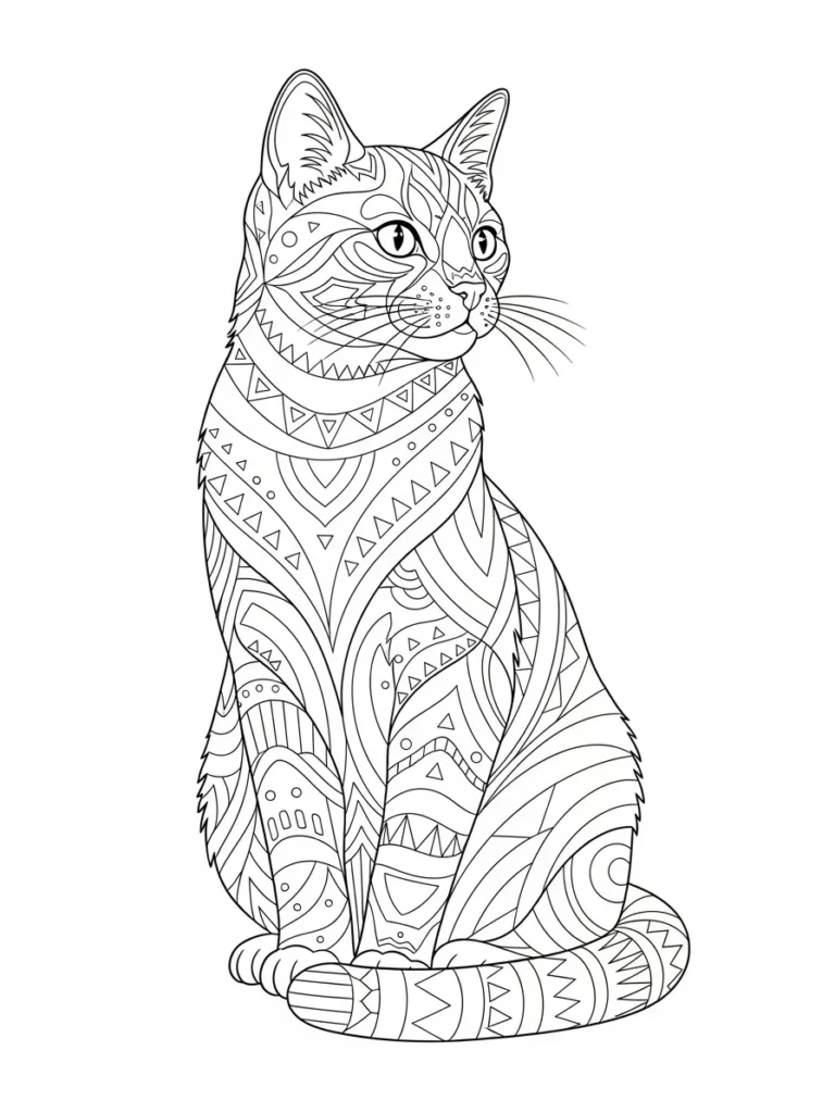 This coloring page shows a proud sitting cat filled with bold tribal inspired patterns from head to tail. The design uses repeating triangles, curves, dots, and flowing shapes that wrap naturally around the cat’s body and legs. The line work is crisp with a consistent medium thickness that keeps everything clean while still offering plenty of detail. The upright pose and forward facing gaze give the cat a calm but confident presence, and the patterned tail curling around the paws adds a balanced and polished finish.