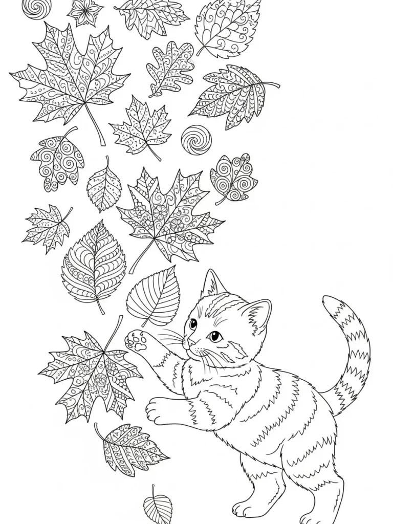 This coloring page captures an adorable kitten mid play as it reaches up to bat at a swirl of falling leaves above its head. The leaves are filled with delicate patterns like spirals dots and soft veins while the kitten itself has simpler fur lines that keep the focus on its movement and expression. The line thickness stays clean and even which makes the design feel light and airy. The layout flows upward with the leaves creating a sense of motion that feels fun and seasonal without feeling crowded.
