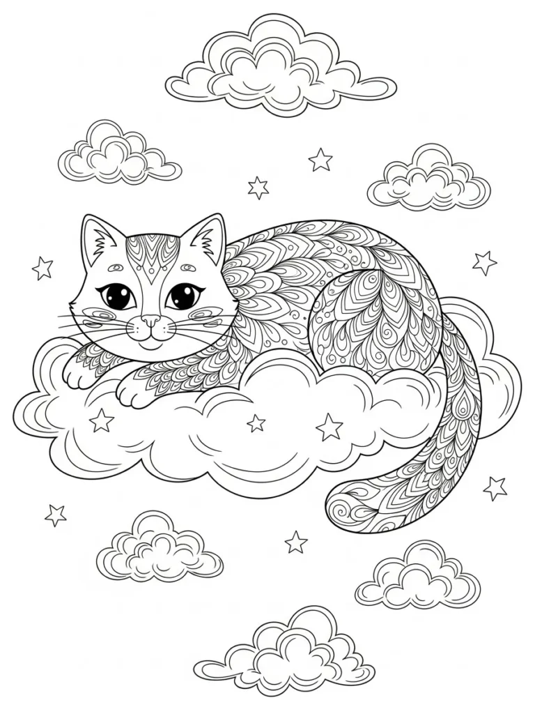 This coloring page shows an adorable cat resting on a soft cloud, surrounded by puffy clouds and tiny stars floating all around. The cat’s body is filled with elegant feather like and paisley inspired patterns that flow smoothly from head to tail. The clouds are outlined with rounded gentle lines that keep the scene light and airy, while the stars add playful little details without crowding the page. Line thickness stays clean and balanced, giving a calm layout that feels open and peaceful.
