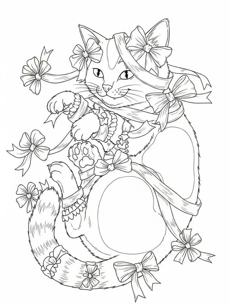 This coloring page features an adorable cat playfully tangled in flowing ribbons and oversized bows from head to tail. The bows are soft and rounded with gentle folds, while the ribbons curl and loop around the cat’s body in a fun and whimsical way. The cat itself has smooth fur lines and a cute rounded pose that keeps the design balanced and charming. Line thickness stays clean and slightly varied, giving the bows definition without making the page feel too busy.