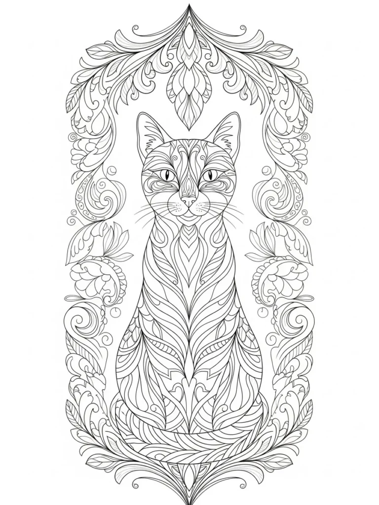This coloring page features a graceful sitting cat centered inside an ornate frame of flowing leaves petals and swirling botanical shapes. The cat’s body is filled with layered symmetrical patterns that feel mandala inspired, while the surrounding frame adds movement and balance without stealing the spotlight. Line work is fine and detailed with smooth curves and repeating motifs that feel intentional and calming. The overall layout is tall and elegant, giving the page a refined almost decorative art print look.