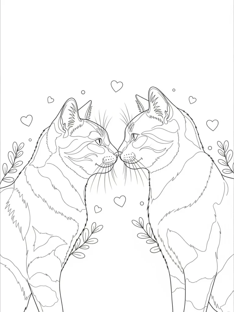 This coloring page features two sweet cats facing each other with their noses gently touching, surrounded by tiny hearts and soft leafy accents. The fur is drawn with smooth flowing lines and subtle markings that keep the design simple yet expressive. The symmetry of the two cats creates a balanced and calming layout, while the small hearts floating around them add a romantic playful touch. Clean medium weight lines make the page easy to color without feeling too plain.